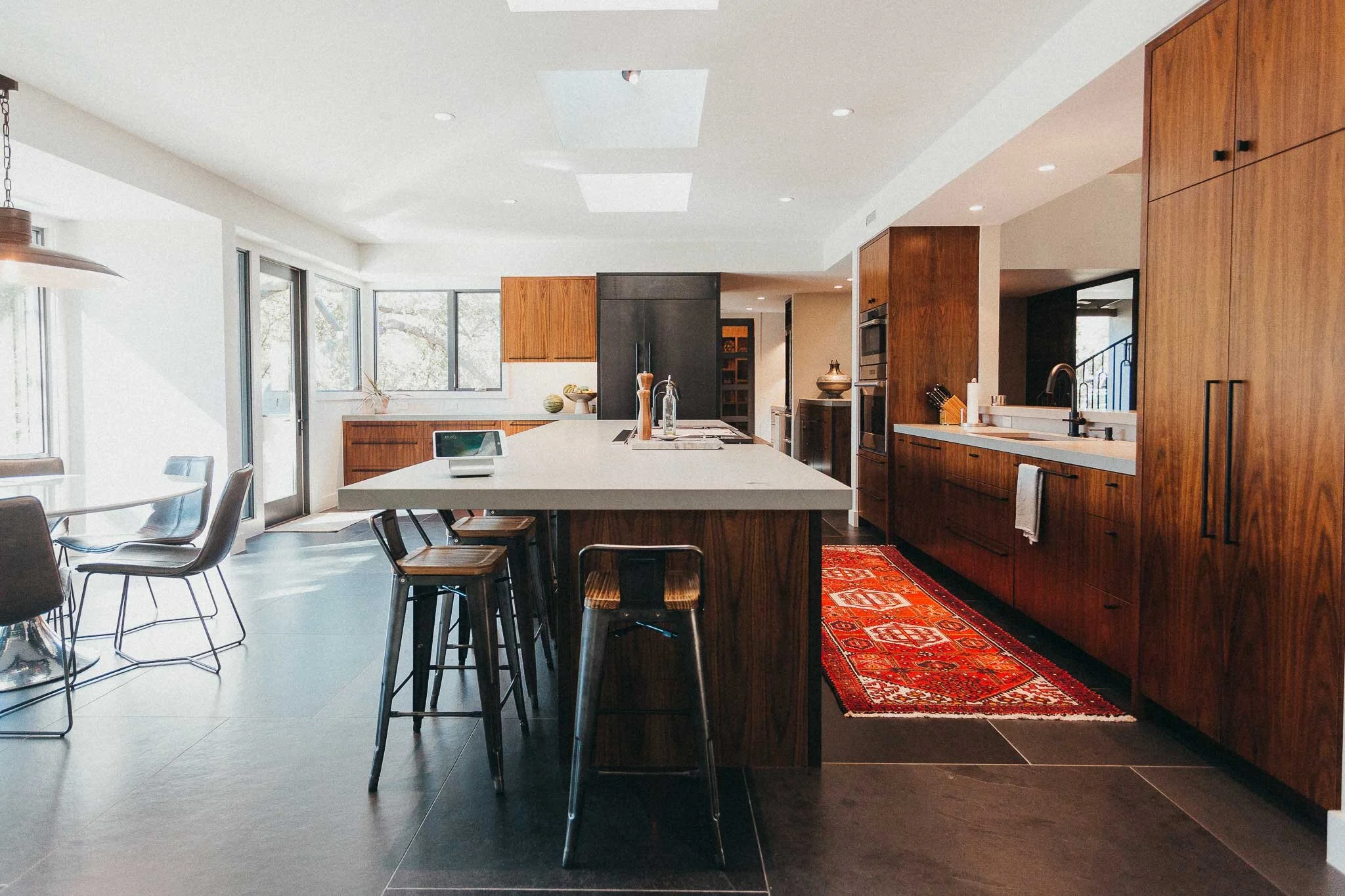 The dining room sits on a breathtaking suspended walkway and ceiling clutter is kept to a minimum thanks to Sonance Invisible Speakers.