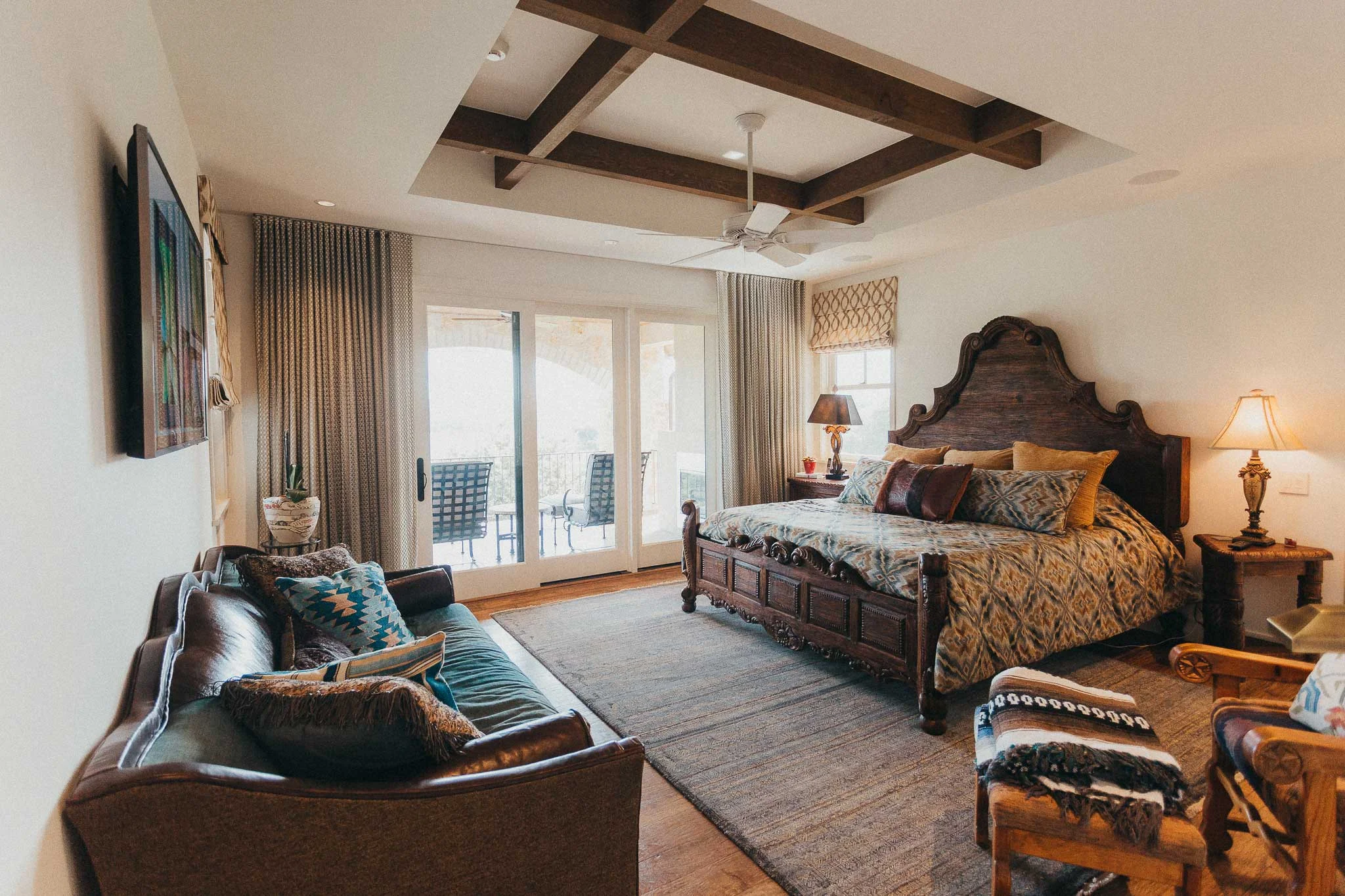The master bedroom is a cozy space complete with a 4K 55" TV and surround sound speakers